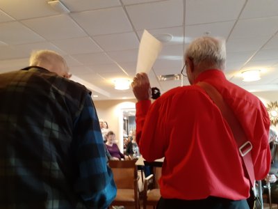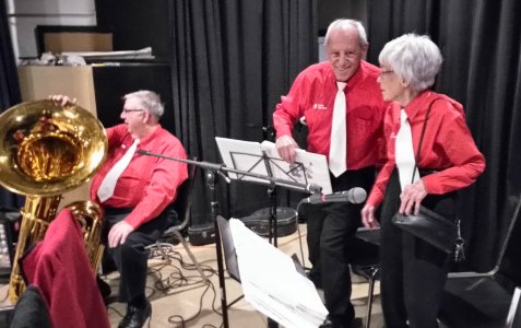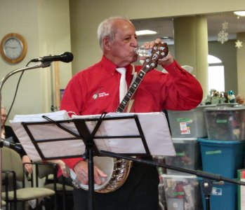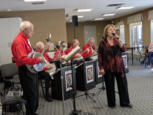 Amica Newmarket Retirement Community Newmarket, Ontario January 16, 2019 This is the first time we have played for the folks at the Amica residence in Newmarket, Ontario. The audience was very welcoming and I think I can say we all had a great time. We had a fine complement of band members in attendance. The room we played in was nice plus we had a 'green room' immediately behind it for coats and instrument cases. Our vocal soloists were Sheila Dickenson, Earl Craddock, Jim Groulx, Jim Hindorff and Dave Robinson. Banjo solosts were Earl Craddock (multi talented), Bev Cattle and Al Pounsett. A nice event for the band. Photos by Pounsett.