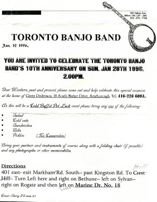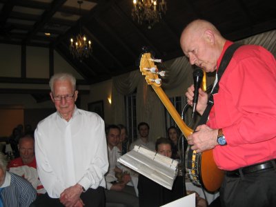 Special Birthday Entertainment Glenerin Inn, Mississauga, Ontario April 13, 2019 The Toronto Banjo Band was invited to provide the entertainment at Mr. Earl Fee's 90th birthday party at the impressive Glenerin Inn in Mississauga. Mr. Fee has been a champion senior runner, a holder of many event titles. Our president, Glen Midgley, pulled together many clips and photos of Earl and created a presentation board for him. It was very well received by Earl and the party guests. Photos were taken by Patrick Longhurst and Jeff's wife Barb Jordan. Details of the event were provided by Glen Midgley. Thanks Barb, Patrick and Glen.