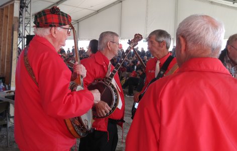 Markham Fair Markham Fair Grounds, Ontario October 5, 2019 The band assembled at the Markham Fairgrounds for another rousing afternoon of big tent banjo playing. Quite a few members made the drive to north Markham for the show. Bob Armstrong made a guest appearance singing and playing after unfortunately missing last year. It was great to have him back at the Fair. Bob Kobe made the trek down from Bracebridge. We missed having Tom Elliot on tuba and Sheila Dickinson on tenor banjo this day. We played our two sets, at 2:30 pm and 4:00 pm. For once, it was a beautiful sunny fall day and the parking lots and fairgrounds were packed. Our early show had a near record crowd in the big Entertainment Tent. We followed the unicycle rider and juggling kids' comedian both times. We watch his act from the wings. The kids love him. The Markham Fair is an annual highlight for many of us in the band .. it's fun playing in the fall farm fair environment. This was one more in a long long string of appearances. We are grateful. Photos below by Pat Currie, Jack Currie and Al Pounsett..