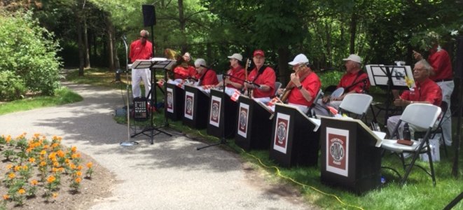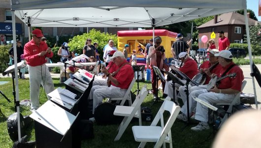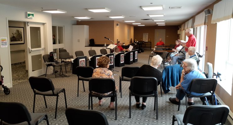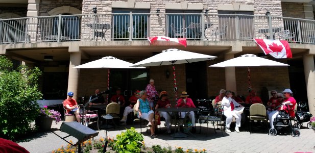 Amica Newmarket Retirement Community Newmarket, Ontario July 1, 2019 Our return visit to the Amica residence in Newmarket, Ontario. We were here before back in January. This time we played outside in a really nice shaded patio area. This being Canada Day, we started off with O Canada. Our play list also included Bobby Gimby's Canada song from 1967. A really lovely setting for some banjo playing and listening. Some of the band's wives and sweethearts attended as the plan was to go out for an early dinner after the show in Aurora. Director Groulx was able to cajole a gentleman in the audience to come up and sing along with the band and three lovely ladies who also volunteered. Band singing was handled by Sheila, Dave and the two Jims. A little solo work on the banjo by Bev, Al and Jim Groulx. A fine day. Pictures by Pounsett and Midgley.