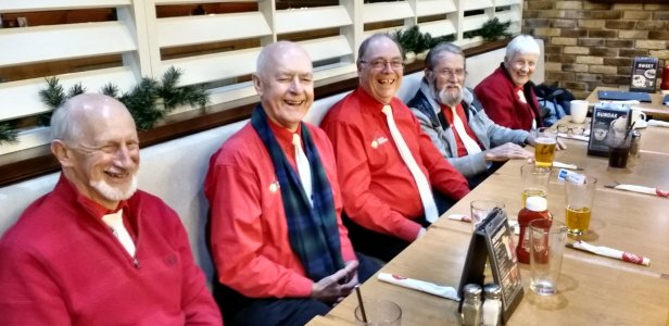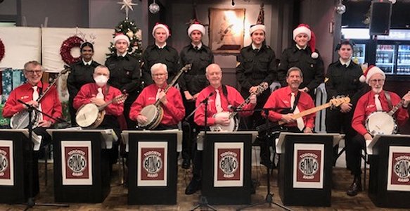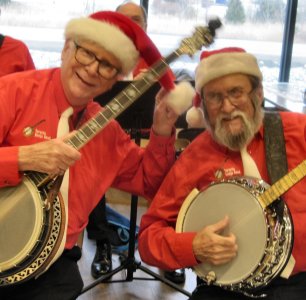 The Elden of Bradford Bradford, Ontario December 12, 2019 We had played at the Elden in July and were invited back to do a Christmas show. We had a larger audience than back in the summer and they were up for some banjo interpretations of old favourites. We had a couple volunteer to do some dancing during one of the numbers and Jim cajoled some ladies and a gentleman up to sing Jingle Bells with the band. We had a lot of fun. With Tuba Tom's retirement, Sheila played bass guitar which she is great at. Al Pounsett, a multi instrumentalist, played the sleigh bells during some of the Christmas numbers. Members of the audience asked when we were coming back again when we were packing up. That is always a good sign. After the show we had a TBB Christmas Dinner at a local Swiss Chalet. A few pictures below by Pounsett and Bev. Thanks Bev for sending these in..