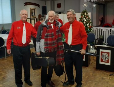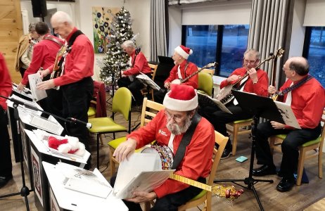 Royal Canadian Legion Branch 266/046 Toronto, Ontario Christmas Turkey Dinner for the Sunnybrook Hospital Veterans December 1, 2024 This Legion invited us once again to play for the Sunnybrook Hospital K Wing veterans. They were honouring the veterans with a Christmastime turkey dinner. There were familiar faces among the guests, some in their nineties and one a WWII vet. The band was in good form with Jim leading and singing, Bev doing her great solo on Joplin's The Entertainer, Bob on bass, and the rest of us (Patrick, Glen and Al) picking and strumming. The turkey dinner was great (the band was treated to lunch) and the audience appreciative of our entertaining. Once again Santa Claus showed up and greeted the guests. Each member of the band was given a tin of sugar cookies at the end of the show. A nice touch for Christmas. Watch this space for some photos of the event.