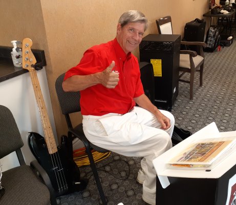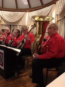 We are set up on a large raised bandstand in the hall. Very nice arrangement for us and our audience.