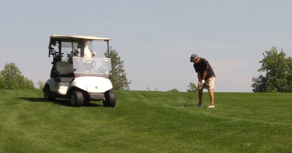 Jim preparing to shoot on the 11th fairway. Alan B. in the golf cart.