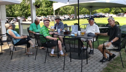 Back at Pounsett's patio: Jim, Jack, Bob W., Bob M., Alan B., Alan's wife Maureen, Al's wife Betty and Glen.