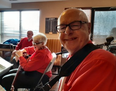 Chartwell Barton Retirement Residence Newmarket, Ontario October 24, 2019 I think this was our third (maybe fourth) visit to the Barton Residence in Newmarket. A nice bright lounge area to play in at the Barton. The audience was appreciative of the older numbers we play and some came up to tell us that after the show. The band was treated to birthday cake when we finished as we were part of their monthly mass birthday celebration event. Sadly, this was likely long time band member, Dave Robinson's, final gig with the Toronto Banjo Band. Dave has been with the band for many decades as a tenor player, fine singer, board member and general mover and shaker. Dave was also the founder of the Toronto Strummers. The Strummers were a subset of the band, that performed at the North American International Banjo Convention in Dearborn Michigan. When the full TBB could no longer perform at the convention, the smaller Strummers took over. Dave's move to the Maritimes will leave a hole in our roster. All the best to Dave and his wife Beth on their new adventure.