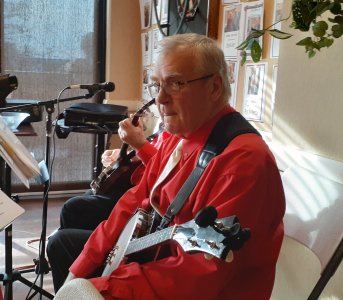 Kingsway Place Retirement Residence Aurora, Ontario July 24, 2019 We have played at the Kingsway in Aurora several times now. Kingsway Place has added a large expansion to their building which looks great but unfortunately eliminated the garden patio setting were have played before. This time we were inside, but a nice room to play in nontheless. The audience was in fine form and Jim weaved his magic in getting some of them to come up and sing with the band. Barb Jordan joined the band today and sang some of her great numbers to the plunking banjos. The residence fed the band before we played which was very nice. Some of us come from a long way off to play these gigs and somehow miss lunch. We are grateful to the Kingsway Place for looking after us. Before we left, the audience was calling for a return concert by the Toronto Banjo Band. Thank you. Some snaphots below by Pounsett. . Our concert room including tenor banjoist Jack.
