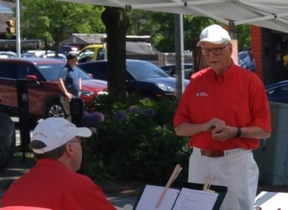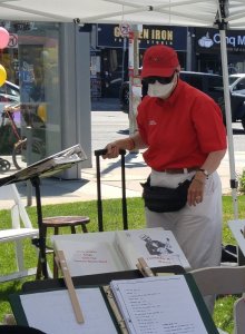 Our spot under the pavillion tents in front of Shoppers Drug Mart. Barb sang a duet with an appreciative audience member. Jim and Bev looking on.