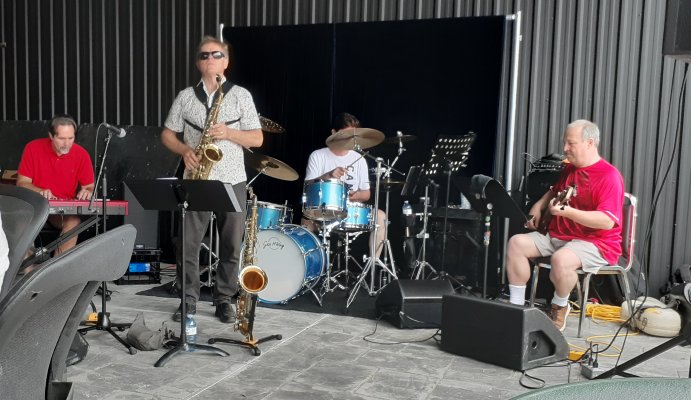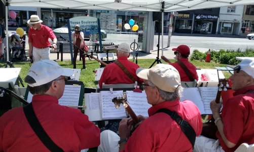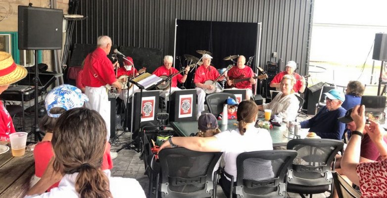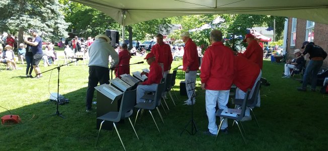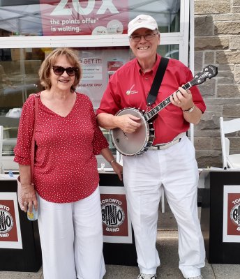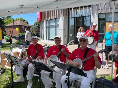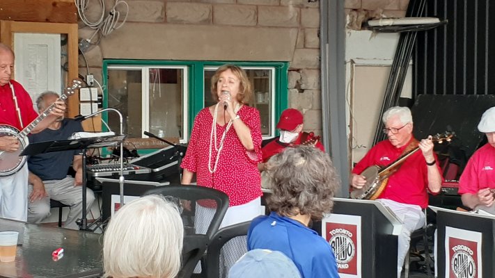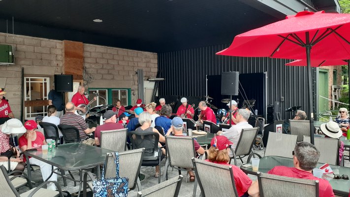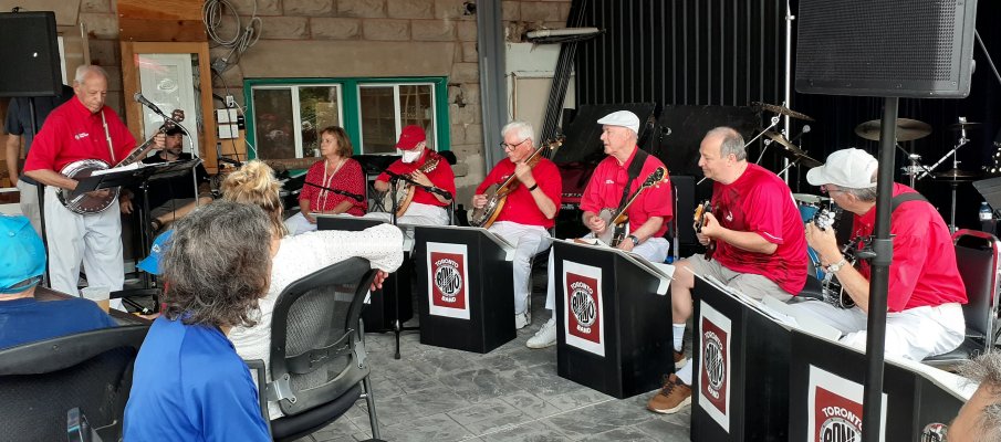 Canada Day at the Marsh Street Centre, Clarksburg, Ontario. July 1, 2023 The Toronto Banjo Band was invited to play at the Marsh Street Centre in Clarksburg, Ontario. For those geographically challenged, Clarksburg is immediately south of Thornbury, Ontario on the shores of Georgian Bay. We were set up on the covered patio at the back of the centre. Refreshments were plentiful at the bar and on the BBQ. Our band alternated sets with the Bluewater Jazz Collectived in the afternoon. For our band singing duties were handled by Barb Jordan and Jim Groulx. Band folk in attendance were Barb, Jim, Bev, Al, Glen, Jeff, Bob and Bill. Fortunately Stuart Steinhart filled in for our bassist Bob for the first set when Bob was delayed in getting to the venue. Thank you Stuart. Ward Cornforth, our Clarksburg coordinator, made sure the band had everything we needed to get us settled for the viist and the show. Thanks Ward. It was a bit of a drive to Clarksburg but it was a fine day for all. Our audience was really great. When Barb sang the Canada song, they all joned in. Photos by Ward Cornforth, the Pounsett couple, Betty and Al, and Dillons Photos (705).
