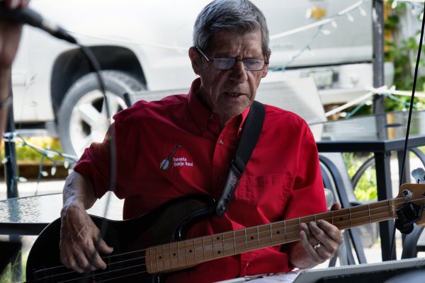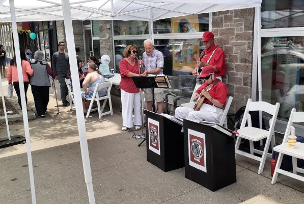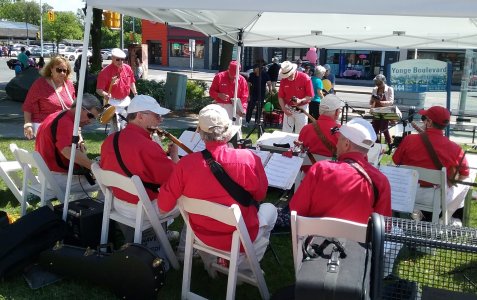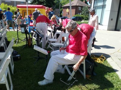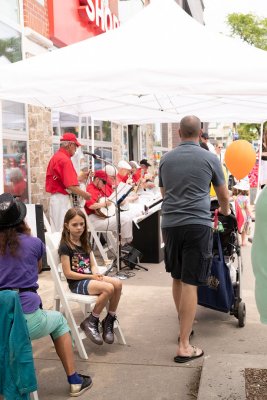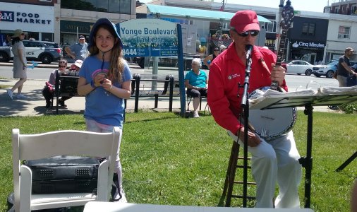 Yonge Lawrence Business Improvement Association Village Day Toronto, Ontario June 10, 2023 Another return engagement at the Village Day put on by the Yonge Lawrence BIA. The weather was perfect, not too hot, not too cold and mostly sunny. We were situated this year in the middle of the strip. In previous years we were at the ends. This meant more traffic and actually some audiences hanging around to hear the band. We saw some band family members and recognized some fans from previous years including, not so little any more, Maizie and her family,. The song Maizie was played for her as in the past. This all started when she was in her stroller nine years ago. Those in the band that took part were Jim, Glen, Barb, Jeff, Bob, Patrick, Bev and Al. Bob was on electric bass (electricity courtesy of Shoppers Drug Mart) and Barb and Jim were on vocals. Another fine but long day for the TBB.