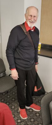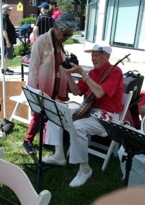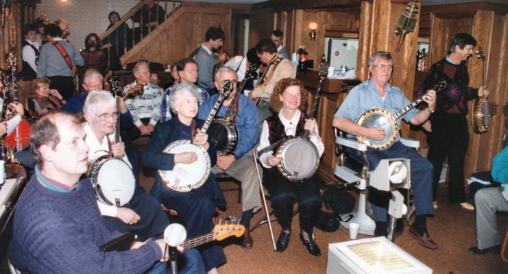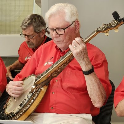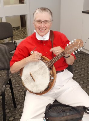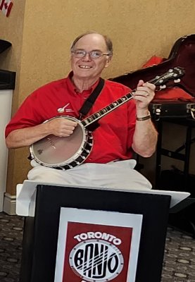 .Patrick with an unusual banjo supplied by a resident at Kingsway North American International Banjo Celebration Dearborn, Michigan, USA May 1-3, 2025 Longtime past member of the Toronto Banjo Band, was seen at the NAIBC this past May with his wife. Roy Hill passes along his best wishes to the band members past and present. Roy played in the All Girls band (again) and was mixing and mingling with folks at the jam sessions. Photo was taken by past member Jack Currie. Thanks for sending this along Jack.