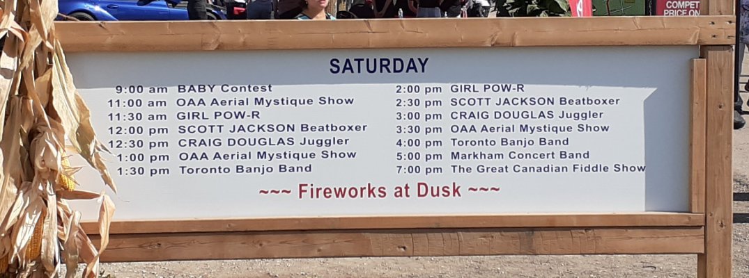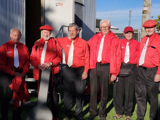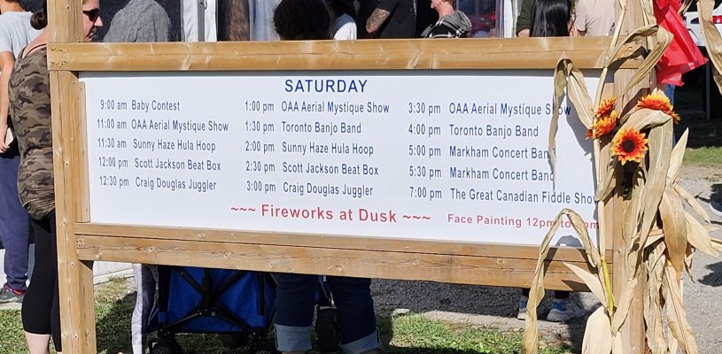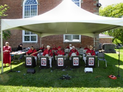 The Markham Fair, Markham, Ontario September 30, 2023 We were back at the Markham Fair just north of Toronto after missing a year due to Covid 19. We almost had our full complement for the first of two sets ... Jeff and Barb made it for the last number. Set number two was fully staffed. The weather was perfect if a little warm (24C) and that brought lots of fair goers out to see the exhibits, animals, crafts etc. Our first set in the Entertainment Tent was the usual half hour, the second set was allowed to run a little longer, maybe 45 minutes. Bandmembers taking part were Direct Jim, Barb, Jeff, Glen, Bev, Patrick, Bob and Al. Our band is a little smaller these days, but we still all have fun and our audience seemed to enjoy the show with singing along and clapping to the rhythm. Hope to see you all next year.