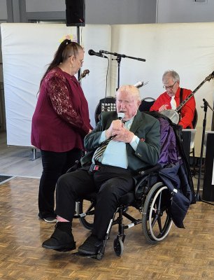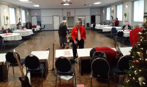 Royal Canadian Legion Branch 266/046 Christmas Turkey Dinner for the Sunnybrook Hospital Veterans December 3, 2023 The Toronto Banjo Band played for the Sunnybrook Hospital K Wing Veterans. The Royal Canadian Legion where the band practices asked us to entertain as the Vets arrived and after their lunch. It was a fine turkey dinner that was served and the band was treated to the same fair. We had six bandmembers at this performance: Glen, Bob (bass), Bev, Carl, Patrick and Al. Unfortunately our director Jim couldn't make it and Glen jumped into the breach managing the setlist development with Bev and directing the numbers at the show. As well as the food and drrink, the band was treated to a box of chocolates each. Very nice. One of the audience joined us on a drumhead for many of the numbers ... not too bad a job. Its an honour to play for these men and women.