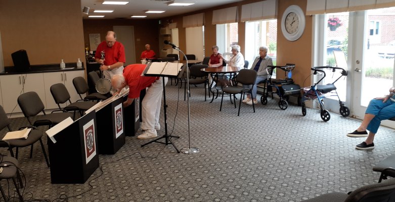 Kingsway Place Retirement Residence, Aurora, Ontario. August 25, 2023 The band returned to the enlarged and very nice Kingsway Place Retirement Residence in Aurora. It used to be named the Kingsway Arms and we had several very pleasant shows there outside in the green space. This time we were inside and played to a good sized crowd, well spaced in these almost post Covid days. Once we started the audience jumped right in singing along and beating time to the stumming banjos. This had to be one of the livliest audiences in recent years. A pleasure to play for them. Jim and Barb sang some numbers and Bev and Al plunked some solos on a few choruses. The band members on the bandstand also included Jeff, Carl, Bob on bass and Glen. Refreshments were available for the band afterwards to set us up for the drive back home. Hopefully we will be invited back in a while for another visit. Snapshots by Al (calling them photos is too generous).