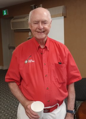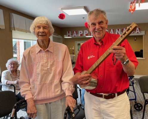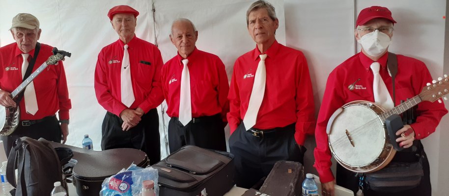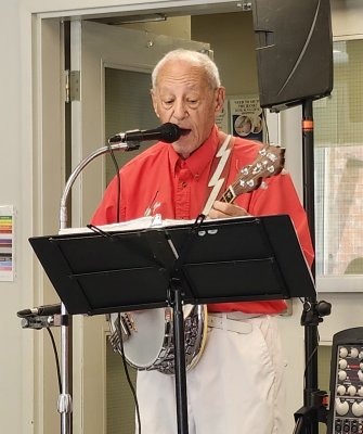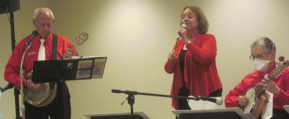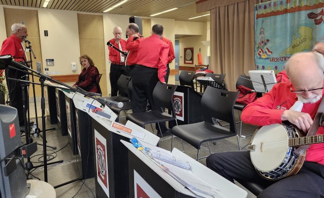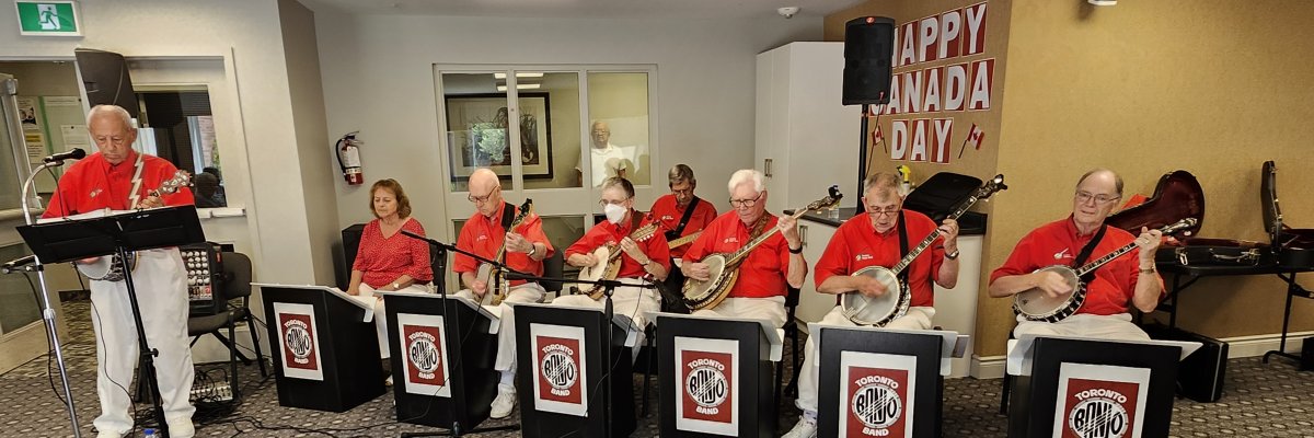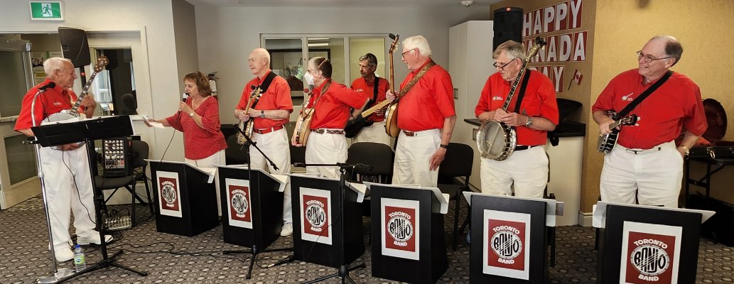 Kingsway Place Retirement Residence Aurora, Ontario July 1, 2024 CANADA DAY Back again at the Kingsway Place in our red shirts and white pants to celebrate Canada Day with the residents. Another appreciative crowd. The Toronto Banjo Band singing duties this day fell to Barb and our Leader, and Master of Ceremonies, Jim. They both did a great job as always. Barb added some trivia questions for the audience on Canada which they answered quickly and correctly. A sharp bunch. Banjo solos were handled by Bev and Al,, rhythm section handled by Glen, Patrick and Jeff, and bass duties fell to Bob. We all had a good time and many audience members came up to us after the show to thank us for spending Canada Day afternoon with them. Photos by Betty Pounsett.
