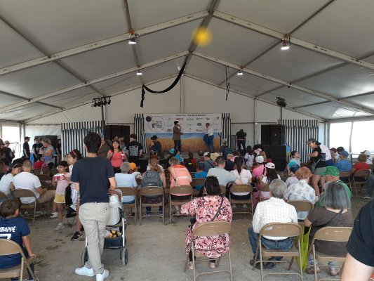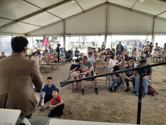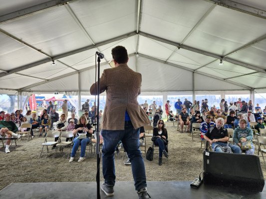 The Fair MC entertaining the crowd while our sound setup is completed.