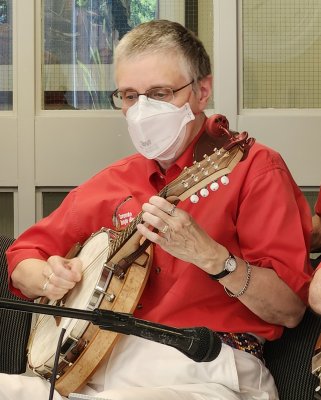 Bev tunes up. No mean feat on a banjo mandolin.