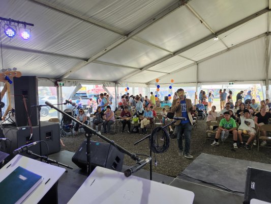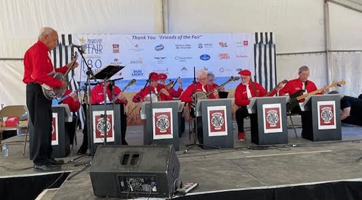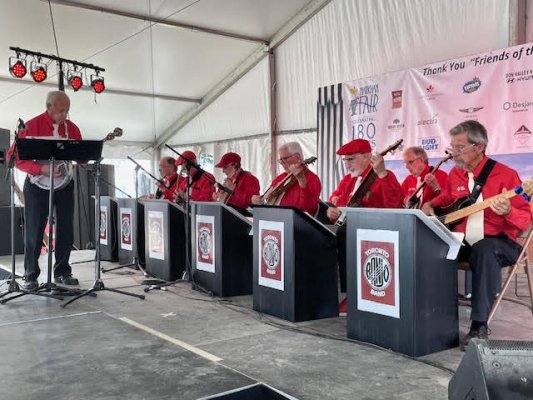Markham, Ontario October 5, 2024 The early fall weather was sunny and mild which made for a big crowd at the Markham Fair. The Toronto Banjo Band played two sets on the Saturday afternoon in the Entertainment Tent. The audiences were good. We even had a mother and son up dancing during the Beer Barrel Polka number. Thanks for your bravery. It's a lot of fun playing at the fair in this quasi outdoor setting. The TBB was well represented with ten singers and players: Barb, Jim and Jeff handled the vocals, Bev did a great job on her banjo-mandolin playing the Entertainer (by Scott Joplin), Bob was on bass and the rest of us were picking and strumming (Bill, Patrick, Glen, Carl, and Al). Thanks Markham Fair for having us back once again. Photos by Barb Jordan and Al Pounsett.