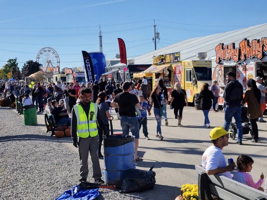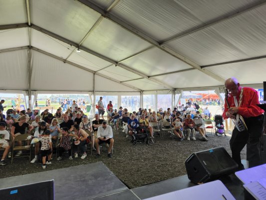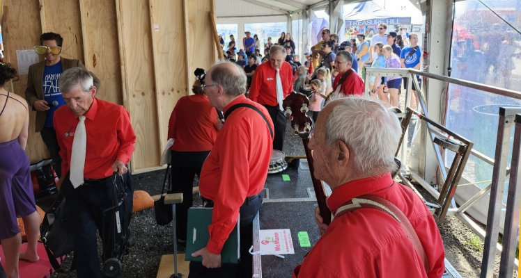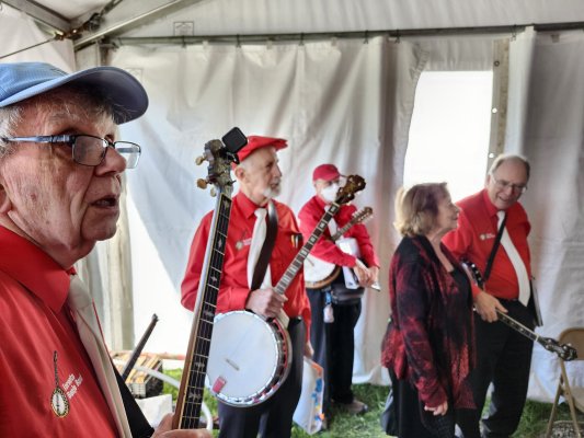 Markham, Ontario October 4, 2025 If last year's date for the Markham Fair had great weather, this year's was even better. Sunny and warm at this north of Toronto institution, the Markham Fair. We have played there for over 30 years, not all of us, but a few originals remain. There was a larger than usual crowd in the Enterntainment Tent to hear us this year ... maybe because we have become an oddity with a singer, bassist and a handful of various types of banjos. If you want to hear live music with tenor, plectrum and mandolin banjos, this was the place in Ontario. Singer Barb did her usual great job on many tunes including the C A N A D A song and of course Take Me Out to the Ballgame. The Ballgame song very likely helped the Toronto Blue Jays dump the New York Yankees at Rogers Centre stadium in Toronto 10 to 1 (the first game of the best of five leading eventually to a birth in the World Series of Baseball). Jim our leader did a great job as always with his banjo playing and vocals. Jeff sang a coupe of old numbers that included some Charleston steps as the band played the choruses. Banjo-mandolinist Bev did her usual flawless rendition of the Entertainer. Performing at the fair is always especially fun as it includes a peameal bacon sandwich and a visit to the refreshment tent at half time. Thanks for the applause.