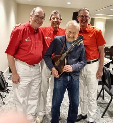 George Linton with his Gibson A model mandolin along with TBB members Jeff, Bob and Doug.