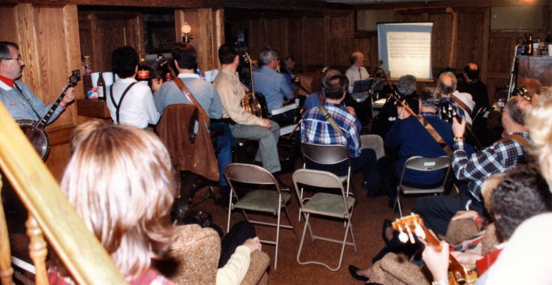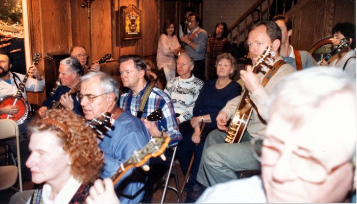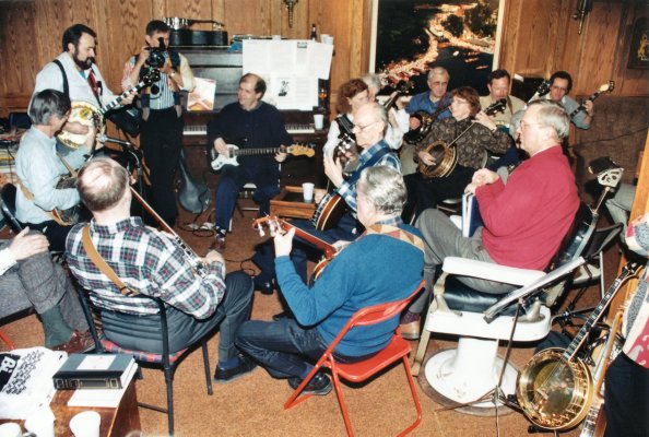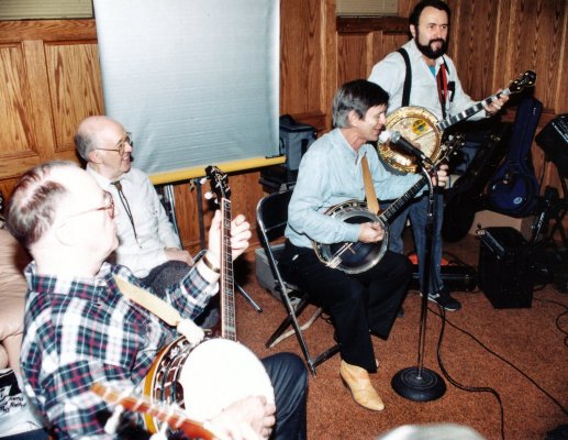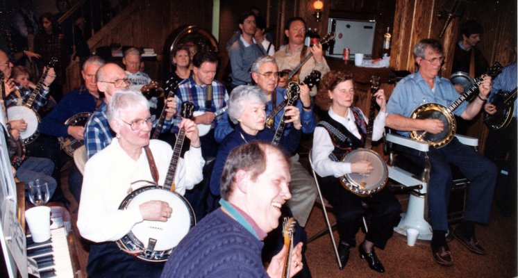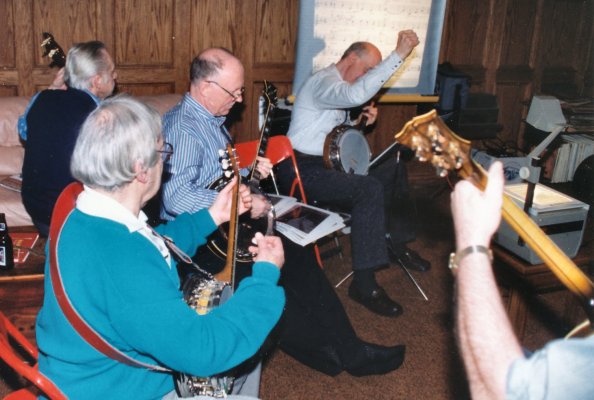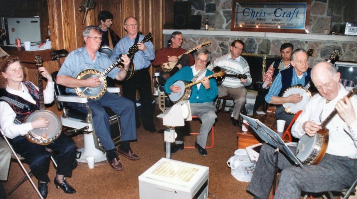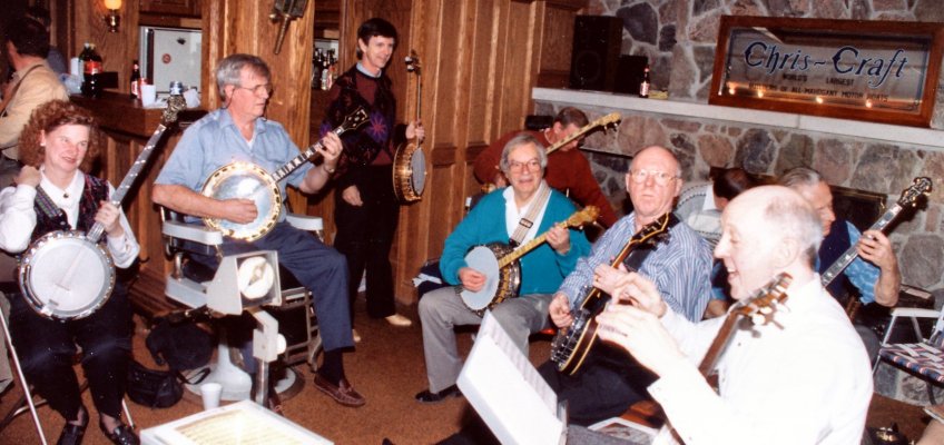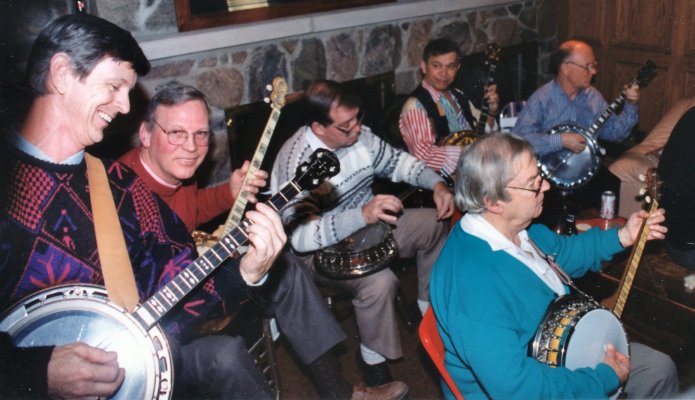 Carl on bass, Bev on mando-banjo, Glen on little tenor banjo, Patrick on full-sized plectrum banjo, Jeff on tenor banjo and Barb our primary singer .