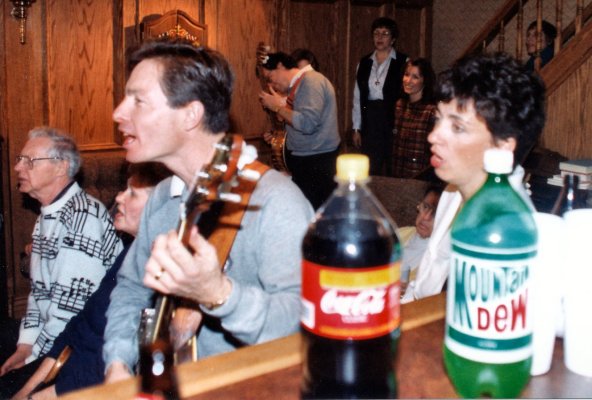 Left: Jim Hindorff belting out a number. Right: Banjo-mandolinist, Bev, on camera.