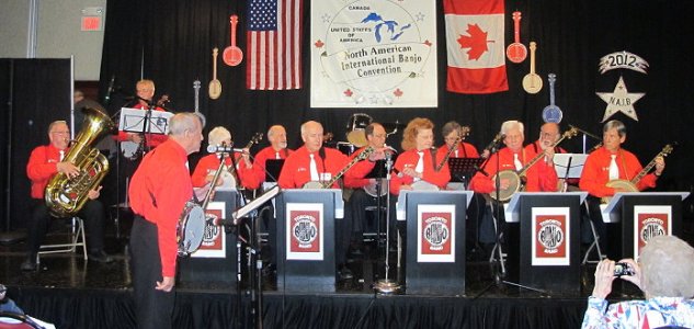 Left: Grace with our leader, Jim G.and tuba player Tom. Right: Grace's sister was in the audience at a 2018 show. Grace, second from the right in the front row, playing with the Toronto Banjo Band at the North American International Banjo Convention in Dearborn Michigan (2011).